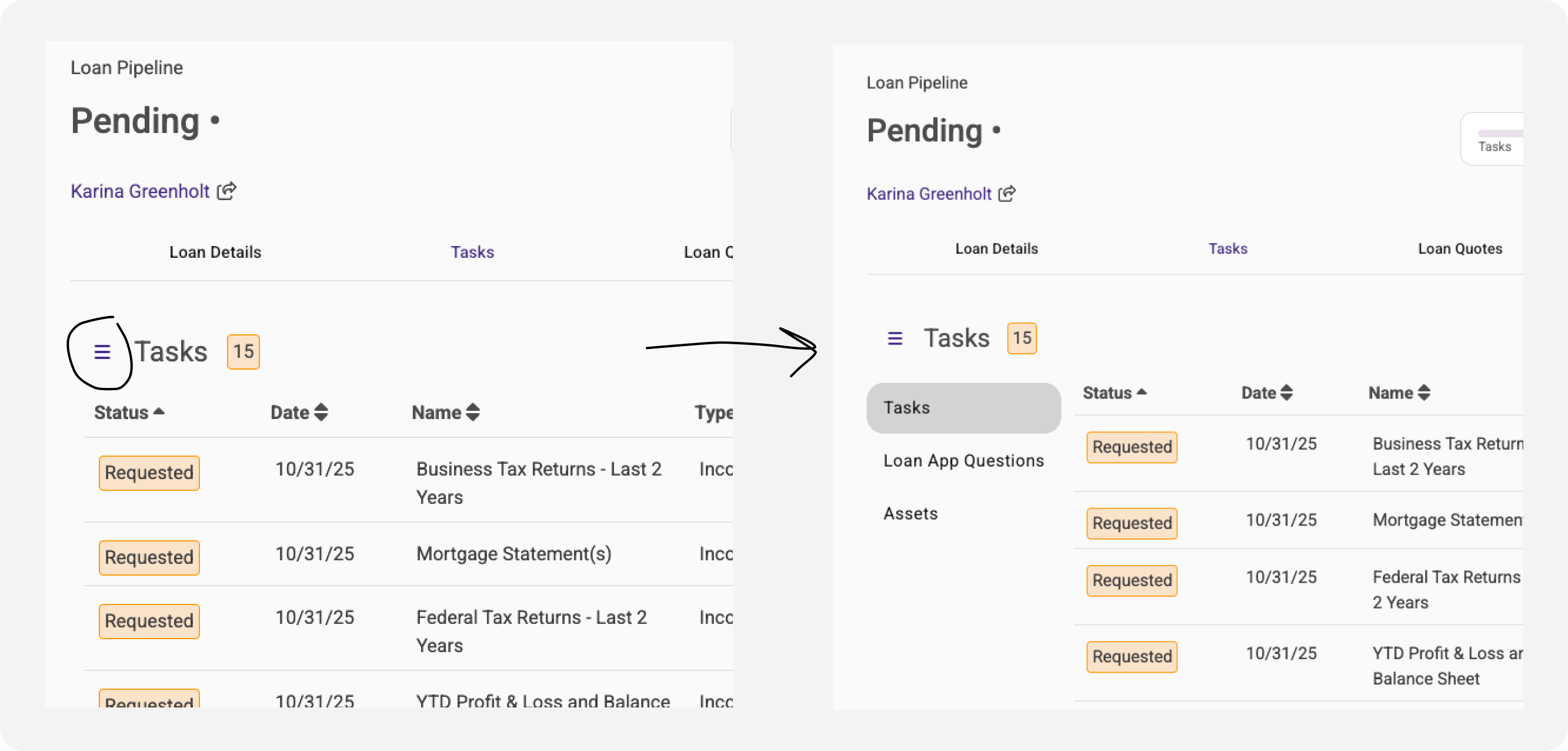 - How to access: As an agent, you can navigate between the three sections of the Loan App Tasks by using the side menu