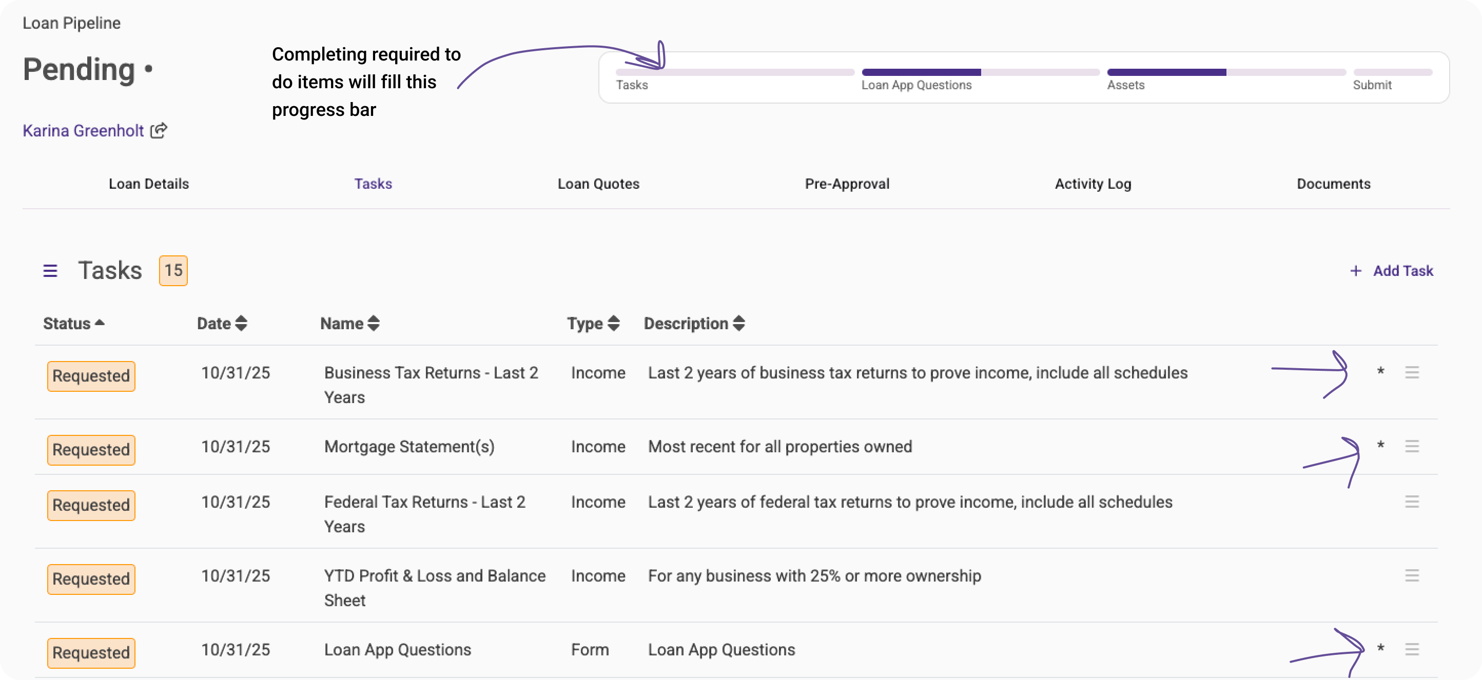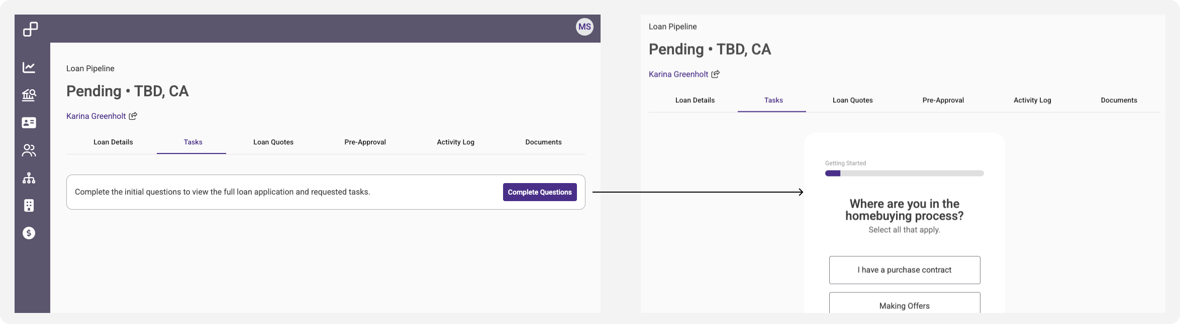 - How to complete: After the loan application is created, as an agent, you can navigate to the Tasks (soon to be named "Loan App Tasks" tab) and click "Complete Questions" to open up the stepper. Once complete, you can view the full Loan App Tasks section to view the loan application and all the assigned tasks/to-dos.