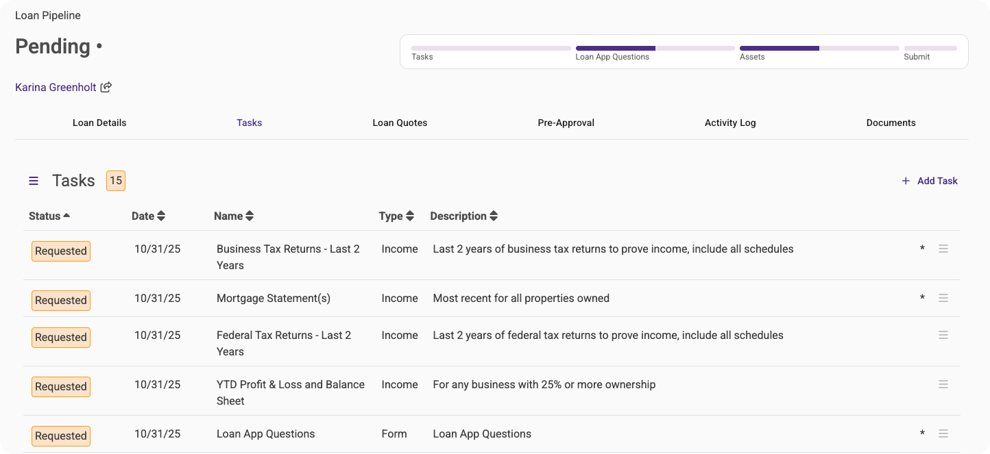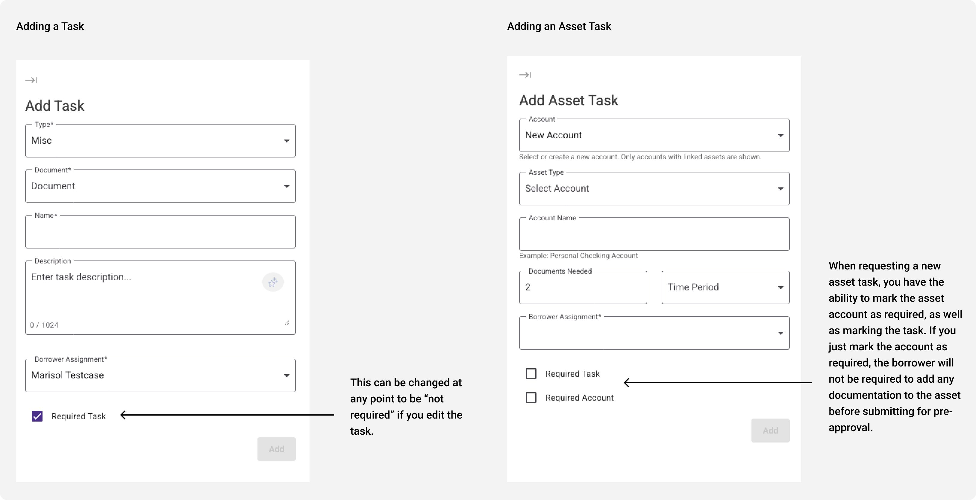 - You can add an asset task from the Assets page or from the Tasks page - this will then show up as an asset request for the borrower to add.