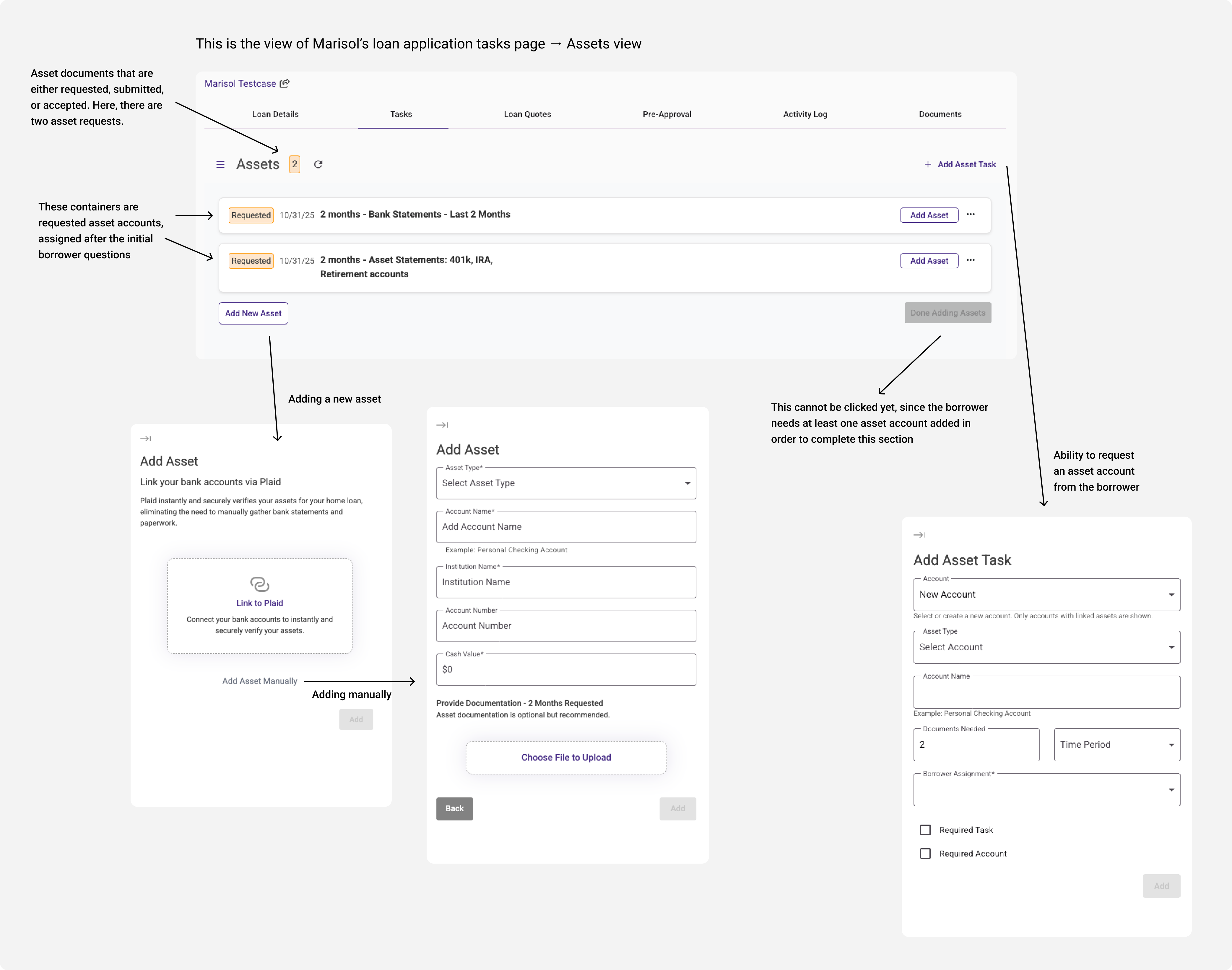 - Assets no longer exist within the loan application, so borrowers or agents can add new assets via the "Add New Asset" button. Borrowers can choose whether to link via a secure Plaid connection, or they can add an asset account manually.