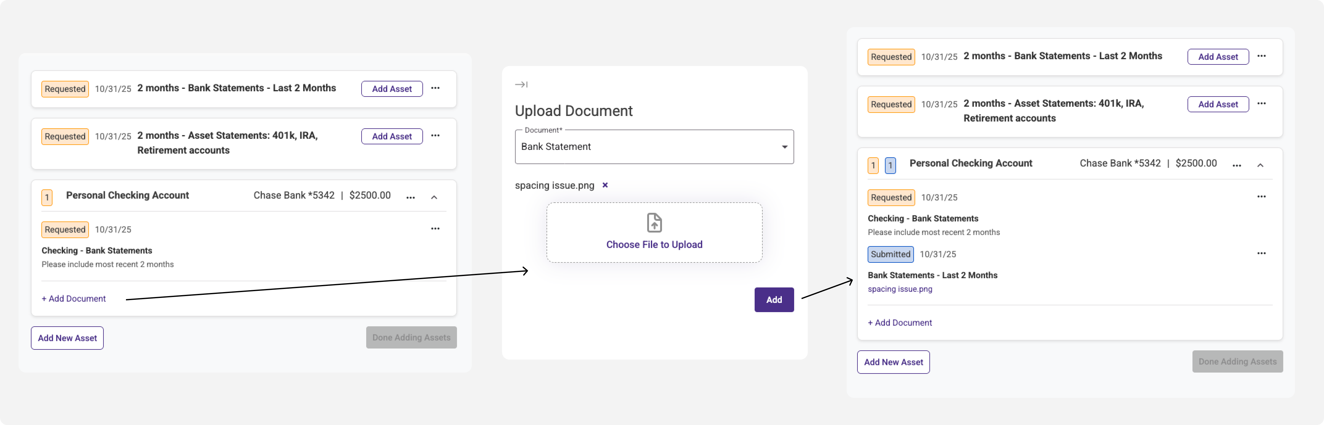 - If an asset is added manually, documentation can be added when entering information or at a later time. It is not required to have documentation for a manually added asset for a pre-approval, though the processing team will require documentation at some point to validate the assets.