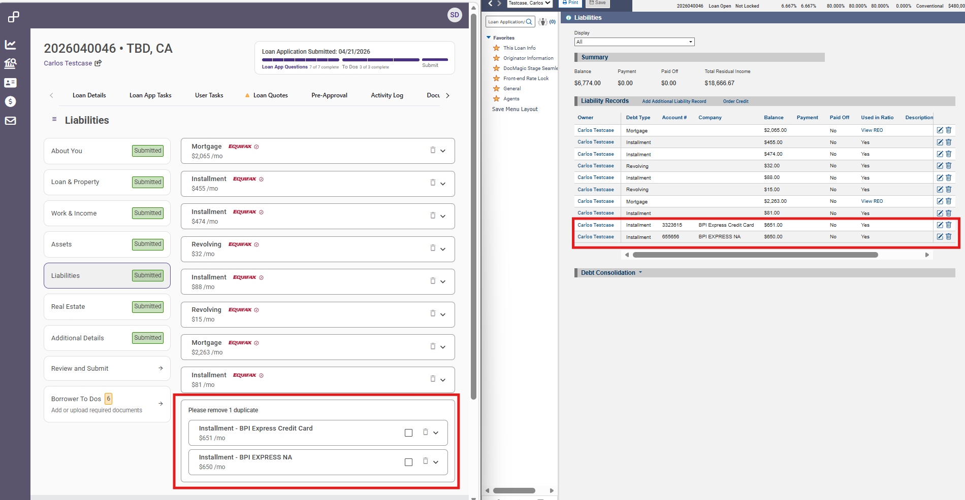 The system now identifies when a liability already exists — whether entered manually or imported from a credit report — and gives users the ability to choose which record to display. This keeps the Liabilities section clean and accurate.