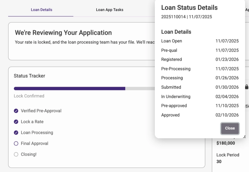 The borrower-facing loan status tracker now displays a detailed, plain-language timeline of all key loan milestones — Pre-Approved, Submitted to Underwriting, Conditional Approval, Final Approval, Clear to Close, and Funding — with timestamps. Tooltips explain each stage, and the full timeline is now visible to all user account types.