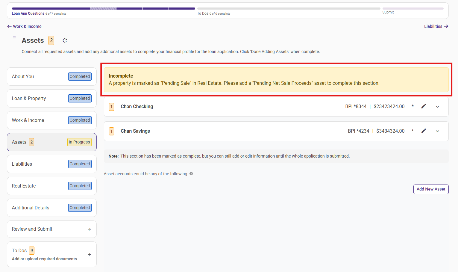Loan applications can no longer be submitted when any property in the Real Estate section is marked as "Pending Sale." A clear error message explains what needs to be resolved before submission can proceed.