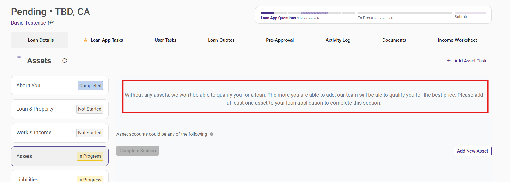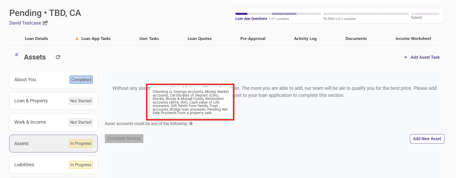 The Assets section now shows a helpful message when no assets have been added, and includes a new tooltip explaining what information is needed. The guidance text only appears when relevant.