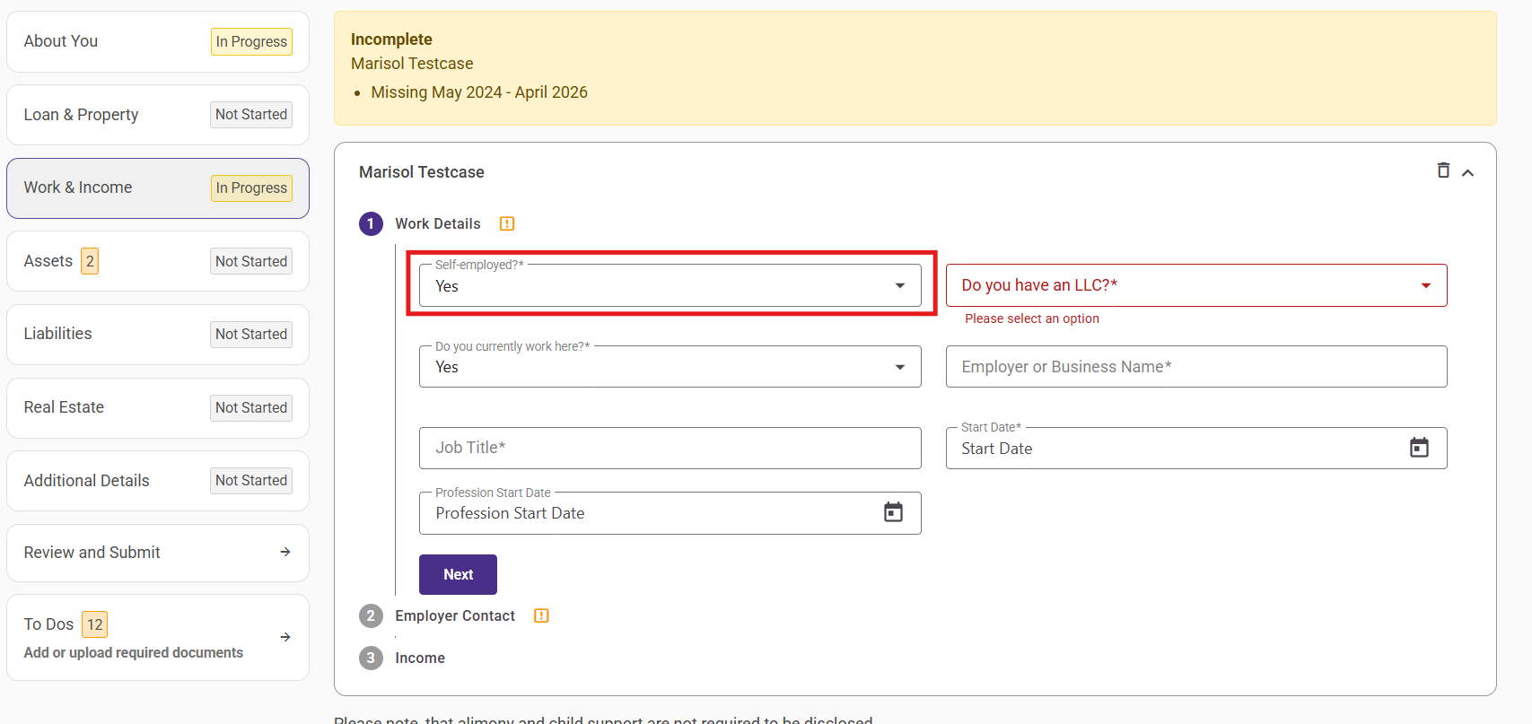 When a borrower selects "Self-Employed" as their income source in the CIL, the Work & Income section of the 1003 now automatically pre-populates with that selection — for both the primary borrower and any co-borrower. No more re-entering the same information twice.