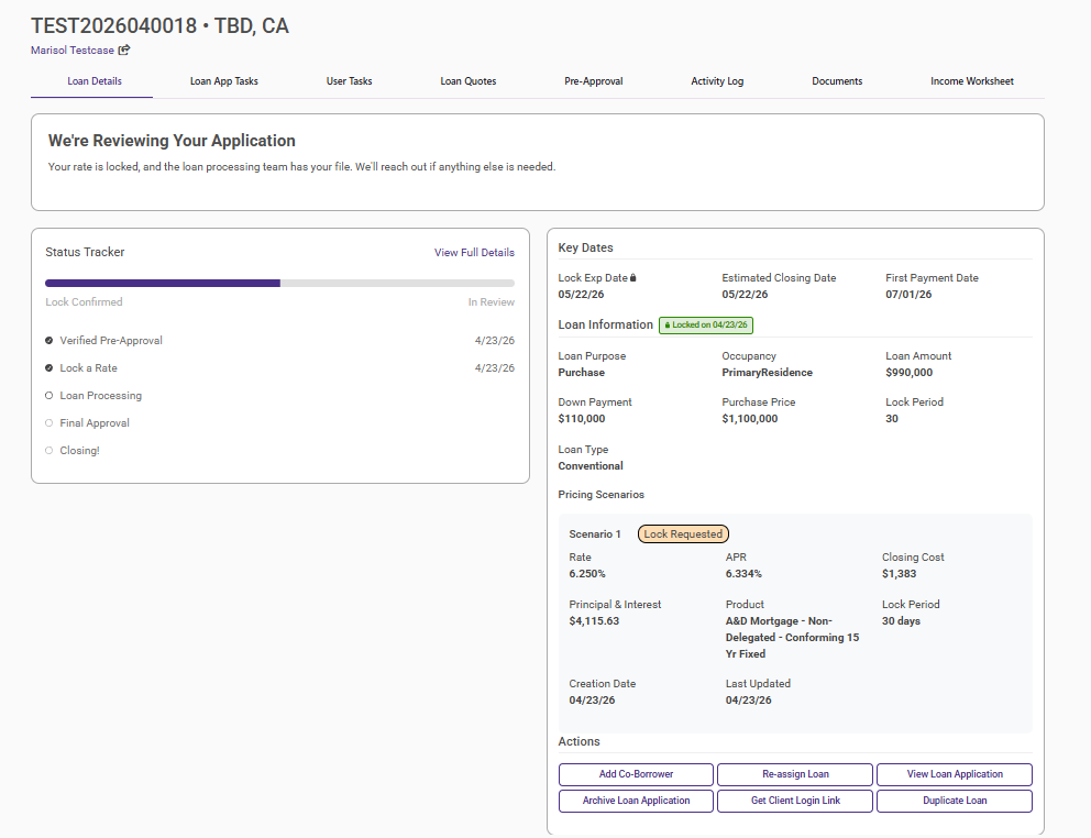 When a loan rate is locked, the platform now clearly displays a LOCKED badge in the Loan Quotes section. Key pricing details — including cost and APR — are now visible directly from the Loan Information section, so there's no ambiguity about whether a rate has been secured.